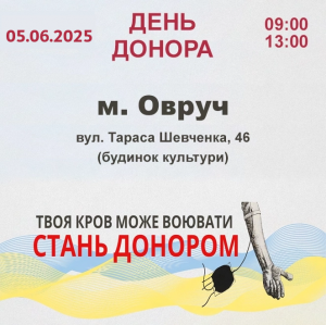 <p> Шановні жителі Овруцької громади, <strong>5 червня</strong> відбудеться <strong>День донора</strong>. До вас завітає Житомирський центр крові і просимо усіх небайдужих долучитися до збору крові для Збройних сил України та обласних медичних закладів!</p>