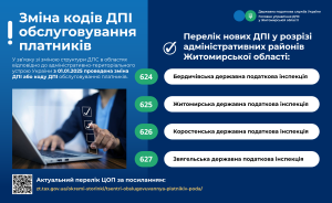 <p style="margin-bottom:23px; text-align:justify"><span style="font-size:12pt"><span style="background:white"><span style="text-justify:inter-ideograph"><span style="vertical-align:baseline"><span style="font-family:"Times New Roman",serif"><span lang="RU" style="color:black">Головне управління ДПС у Житомирській області повідомляє, що у зв’язку зі зміною структури ДПС в областях відповідно до адміністративно-територіального устрою України з 01.01.2025 проведена зміна ДПІ або коду ДПІ обслуговування платників.</span></span></span></span></span></span></p>
