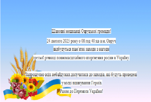 В м. Овруч відбудуться пам’ятні заходи з нагоди третьої річниці повномасштабного вторгнення росіян в Україну