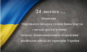 - Звернення Овруцького міського голови Івана Коруда з нагоди третьої річниці повномасштабного вторгнення російських військ на територію України